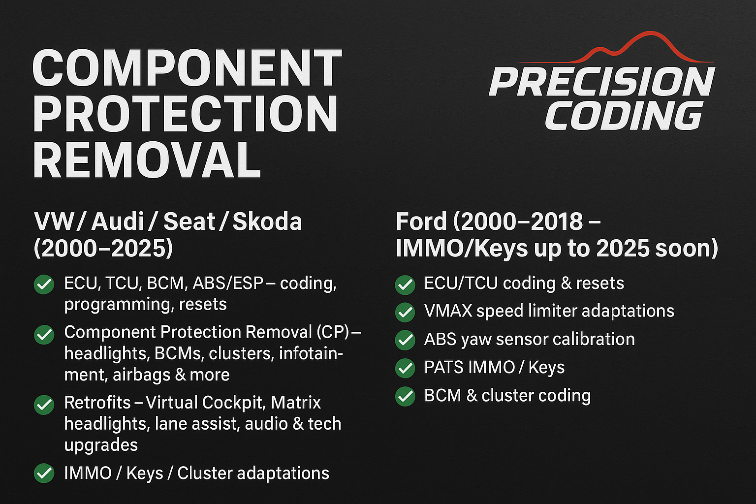 At Precision Coding (by Precision Remaps UK), we specialise in dealer-level coding, programming, and Component Protection (CP) removal for VW, Audi, Seat, Škoda and Ford (2000–2025). Perfect for crash repairs, retrofits, and replacement modules that need unlocking and adaptation.